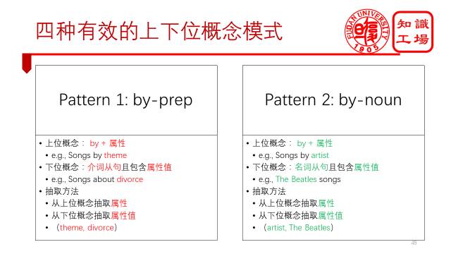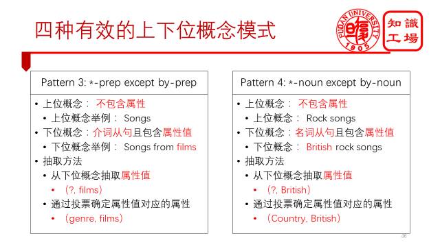 第一种为by-prep的上下位概念组合。其中上位概念需要满足“by +属性”这一条件,例如songs by theme。下位概念需要满足“是介词从句且包含属性值”这一条件,例如Songs about divorce。如果满足这两个条件,那么就可以从上位概念中抽取属性,从下位概念中抽取属性值。这一属性-值对将传递给下位概念的所有实体。