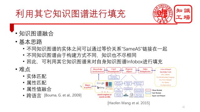 第一类方法是利用其它知识图谱进行填充。主要使用的是知识图谱融合的思想,不同知识图谱的实体之间可以通过等价关系“SameAS”链接在一起,不同知识图谱由于构建方式不同,知识也不尽相同,因此,可利用其它知识图谱来对自身知识图谱Infobox进行填充。此类方法需要解决的难点包括:实体匹配、属性匹配、属性值融合等。如果要做跨语言的融合,还需要解决跨语言的问题。