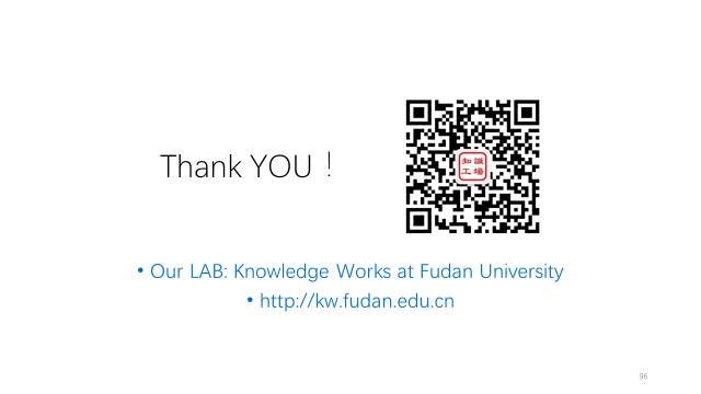 最后,总结下来。针对单数据源百科知识图谱构建的方法就是分为这样三个步骤,先通过知识获取,将网页数据转化为高质量的结构化数据,再通过知识填充,得到更多结构化的知识,最后通过知识更新,保证你的知识永远是最新的。