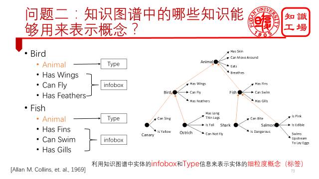 第二个问题是知识图谱中的哪些知识能够用来表示概念?我们根据Allan Collins人工定义的概念的固有特征集合可以发现,可以通过实体的infobox和type信息来表示。
