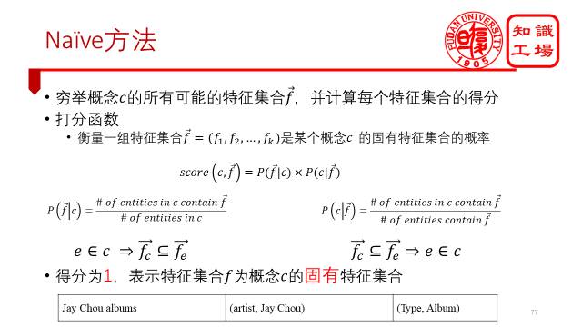 那么,如何从这么多特征中找到概念的固有特征集合呢? 一个naïve的方法就是穷举概念的所有可能的特征集合,并计算每个特征集合的得分。打分函数如图所示,主要是两个概率的乘积。第一个概率表示,如果一个实体属于某个概念,那么它将包含这个概念的固有特征集合的概率。第二个概念表示,如果一个实体包含了某个概念的固有特征集合,那么这个实体属于这个概念的概率。当两边概率都为1时,表示特征集合为这个概念的固有特征集合。