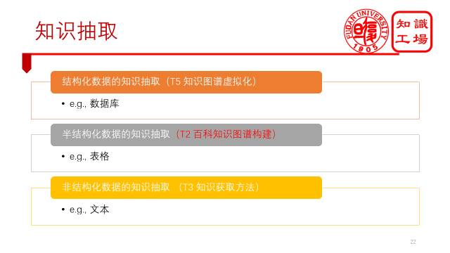 比如T5的知识图谱虚拟化,就是对数据库进行处理的。不过他们并不要对数据进行抽取。具体怎么做的大家晚上听报告就知道了。半结构化数据的知识抽取就是我们百科知识图谱构建要干的事情,主要从百科网站的半结构化数据中抽取知识。然后T3报告的话,就是对文本数据进行开放领域抽取或者限定领域抽取等。