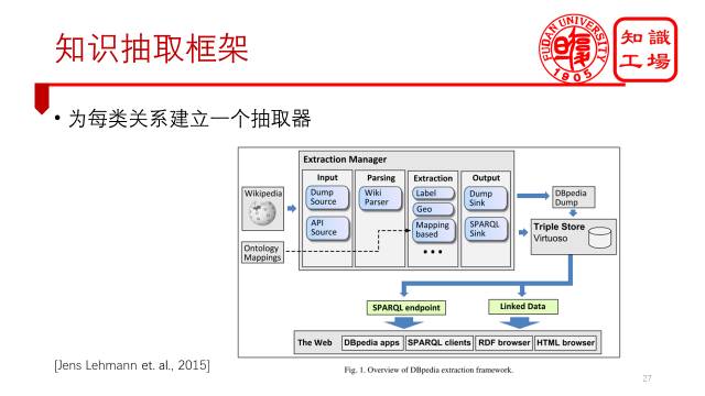 统一的自动抽取框架就是为每类关系建立一个单独的抽取器。如下图所示,这个是DBpedia的抽取框架,输入可以是Dump文件,也可以是API形式。一个网页进来后,首先通过解析器对其进行解析,然后通过不同的抽取器获得不同的知识,再存储到数据库中,供外部应用使用。