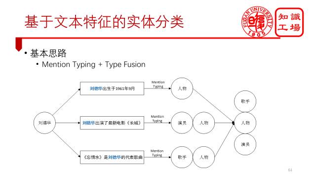 从文本中得到实体的分类结果和利用语义关系特征得到分类结果是不一样的。因为,实体在句子中可能只能表现出实体的部分分类结果,你不能只通过实体在一个句子中的信息来判断它的分类结果,这样是不全面的。比如第一句“刘德华出生于1961年9月”,这里mention刘德华只能推断出它是一个人物。类似的,第二个句子“刘德华出演《长城》”,只能推断出刘德华不仅是一个人物,还是一个演员,但歌手这个身份是无法推断出来的。因此,我们的基本思路是分别对每个mention进行分类,然后合并所有的分类结果。