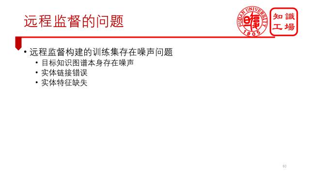 当然,与有监督方法的训练集相比,远程监督方法构建的训练集会存在更多的噪声问题。主要是由三方面原因构成:1,目标知识图谱本身存在噪声,这点无法避免;2,实体链接错误,这也很难避免,因为实体链接本身就是一个很难的问题,准确率不能达到100%;3,实体特征缺失,导致很多正确的分类错误变成了错误标记。举个极端点的例子就是,一个实体,它的所有特征都缺失了,但是根据等价关系知道它有很多分类结果,这就意味着,如果你不包含任何特征,你就能属于这些分类。这显然是错误的。