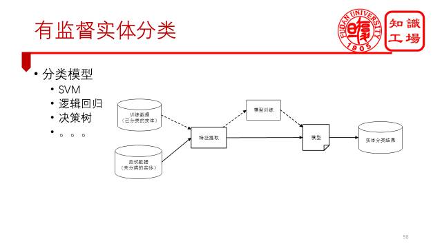 另外一种是有监督的实体分类。这种最为简单,如果你有充足的训练集的话,那么不管你用哪个模型,比如支持向量机、逻辑回归、决策树等等,都能取得非常好的效果。