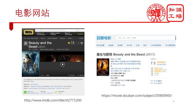 按照以上我所描述的百科类网站的特点,有很多网站都可以称为“百科类网站”。比如电影网站、购物网站、工商信息网站、法律网站等,都是一个页面介绍一个实体,每个实体都有很多结构化的内容。可以通过这些网站来构建领域知识图谱。