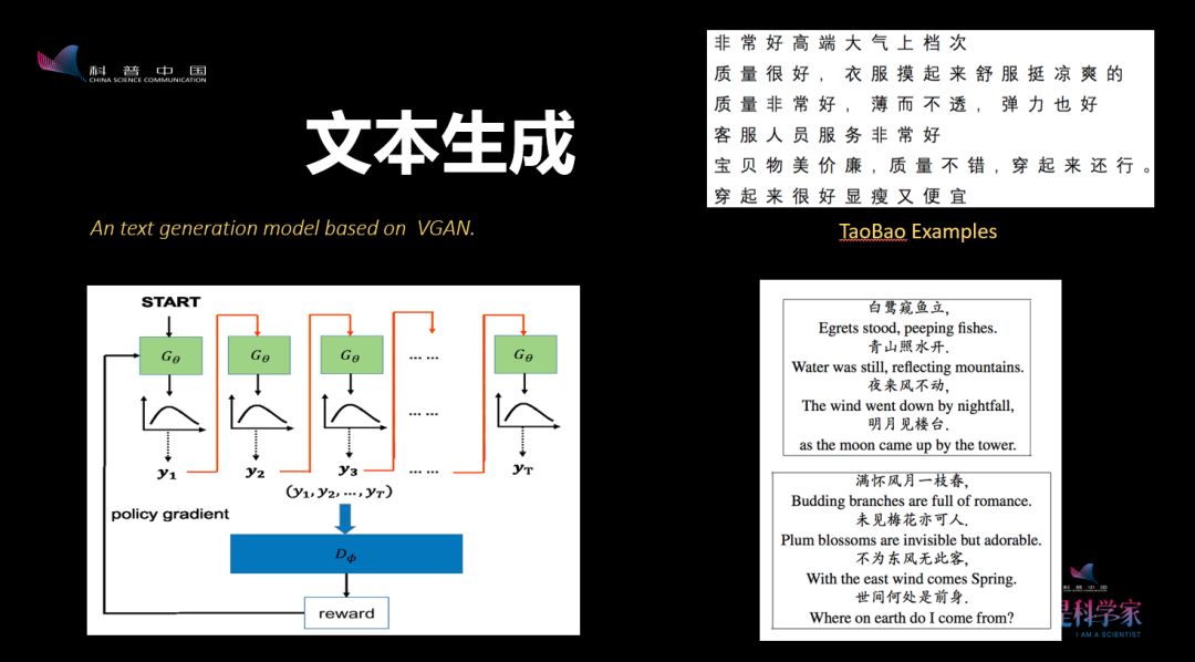 同样的思想也可以用到网购买家评论生成里。我们从淘宝或者亚马逊网站上找了很多人的评论,用这些语料作为训练基础来生成评论。比如关于衣服的:“这个宝贝物美价廉,质量不错,穿起来还行。”“穿起来很好,显瘦又便宜。”这些都是机器生成的,我们可以通过评论里潜在的规律做成这样的工作。