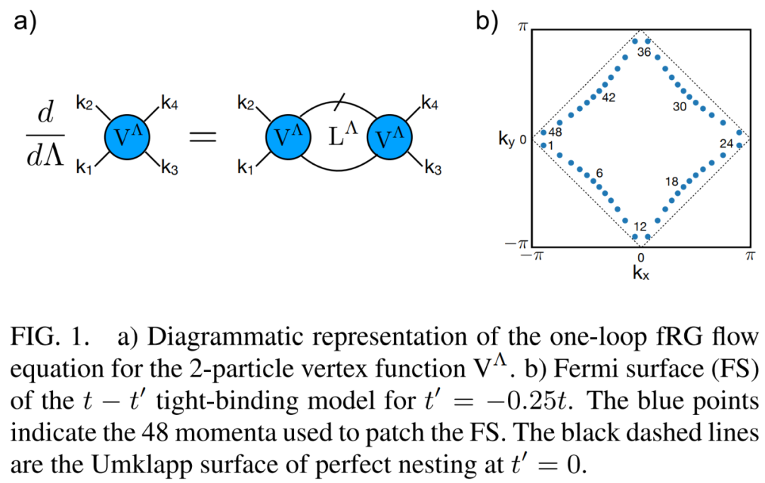 Hubbard 模型的 2 粒子特性通过温度流的一环(one-loop)fRG 方案进行研究,其中的 RG 流如下公式(2)所示。