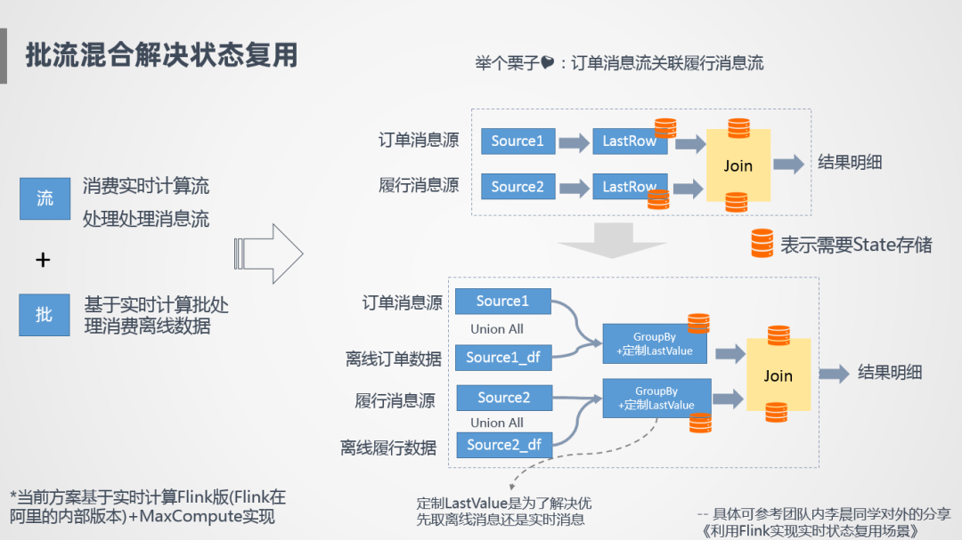 采用批流混合的方式来完成状态复用,基于Blink流处理来处理实时消息流,基于Blink的批处理完成离线计算,通过两者的融合,在同一个任务里完成历史所有数据的计算,举个例子,订单消息流和履行消息流进行一个关联计算,那么会在任务里增加一个离线订单消息源,跟我们的实时订单消息源Union All合并在一起,下面再增加一个Group By节点,按照主键进行去重,基于这种方式就可以实现状态复用。有几个需要注意的点,第一个需要自定义Source Connector去开发,另外一个涉及到离线消息和实时消息合并的一个问题,GroupBy之后是优先取离线消息还是实时消息,实时消息可能消费的比较慢,哪个消息是真实有效的需要判断一下,所以我们也定制了一些,比如LastValue来解决任务是优先取离线消息还是实时消息,整个过程是基于Blink和MaxCompute来实现的。