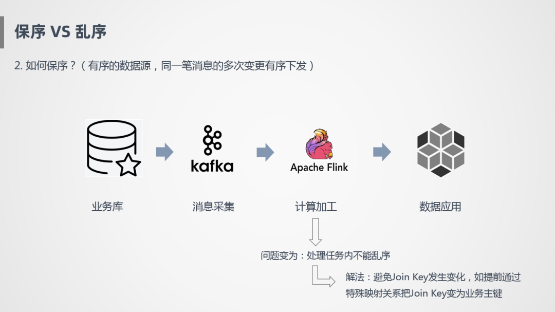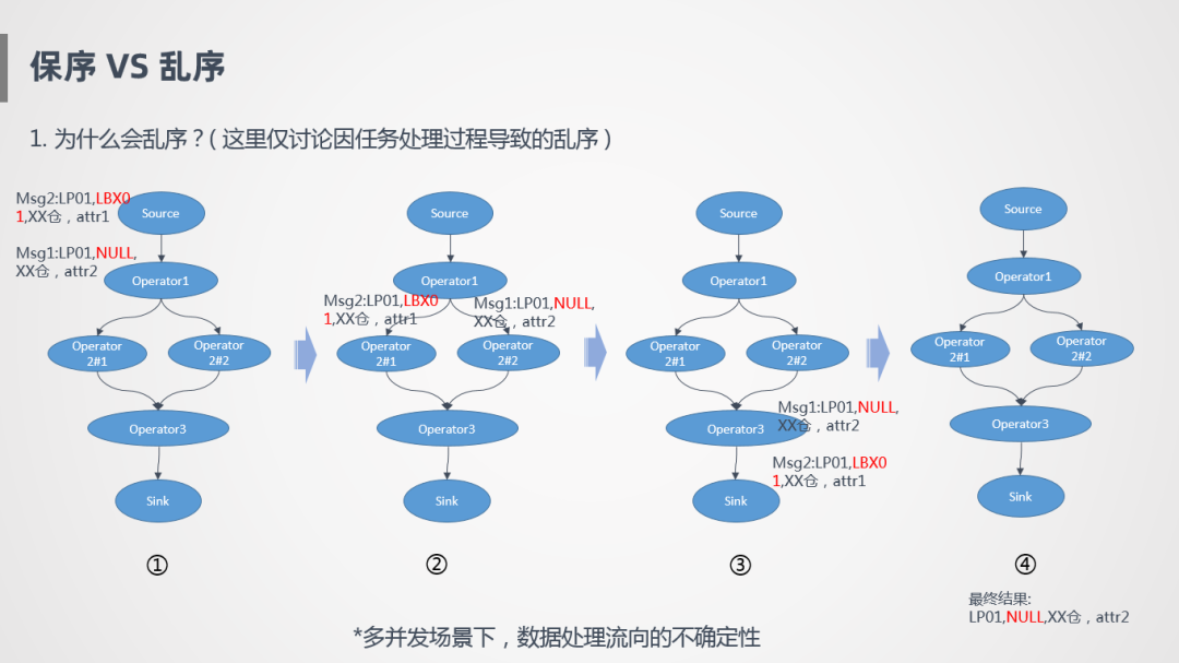 举个例子比如说有两个单子都是物流单,根据单号取一些仓内的消息,消息1和消息2先后进入流处理里面,关联的时候根据JoinKey进行Shuffle,在这种情况下,两个消息会流到不同的算子并发上,如果这两个并发处理速度不一致,就有可能导致先进入系统的消息后完成处理,比如消息1先到达系统的,但是处理比较慢,消息2反倒先产出,导致最终的输出结果是不对的,本质上是多并发场景下,数据处理流向的不确定性,同一笔订单的多笔消息流到不同的地方进行计算,就可能会导致乱序。