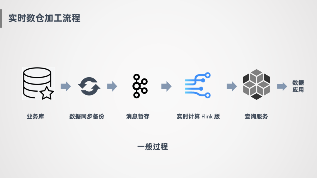 下面简单介绍一下实时数仓的加工流程,一般会对接业务库或者日志源,通过数据同步的方式,比如Sqoop或DataX把消息同步到消息中间件中暂存,下游会接一个实时计算引擎,对消息进行消费,消费之后会进行计算、加工,产出一些明细表或汇总指标,放到查询服务上供数据应用端使用。