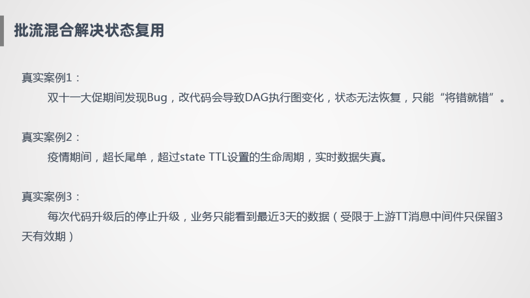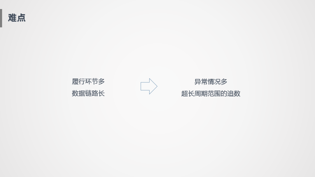 另外一个难点就是我们的履行环节比较多,数据链路比较长,导致异常情况很难处理。比如消息要保留20多天的有效期,State也要存20多天,状态一直存在Flink里面,如果某一天数据出现错误或者逻辑加工错误,追溯是个很大问题,因为上游的消息系统一般保持三天数据的有效期。