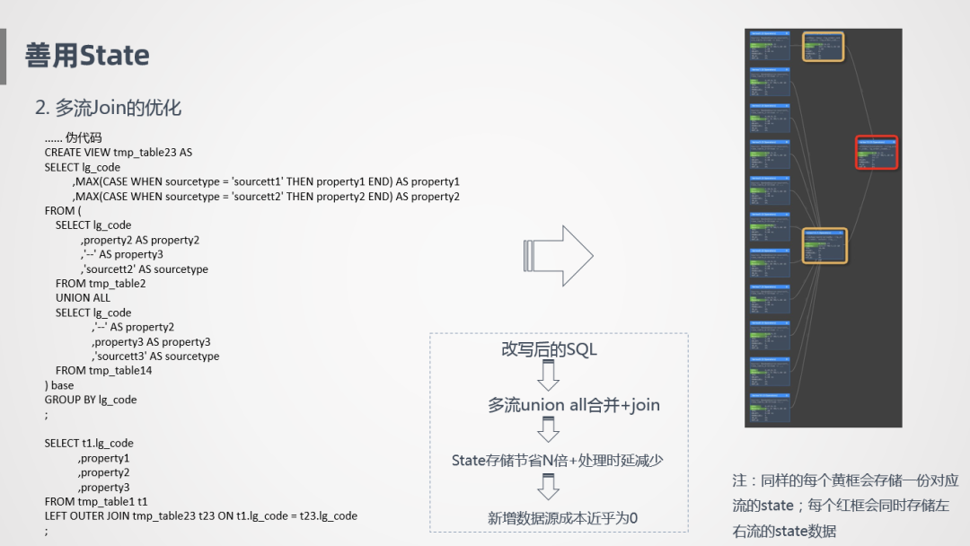 第二个是多流Join的优化,比如像上图左侧的伪代码,一张主表关联很多数据源产生一个明细大宽表,这是我们喜欢的方式,但是这样并不好,为什么呢?这样一个SQL在实时计算里会按照双流Join的方式依次处理,每次只能处理一个Join,所以像左边这个代码里有10个Join,在右边就会有10个Join节点,Join节点会同时将左流和右流的数据全部存下来,所以会看到右边这个图的红框里,每一个Join节点会同时存储左流和右流的节点,假设我们订单源有1亿,里面存的就是10亿,这个数据量存储是非常可怕的。