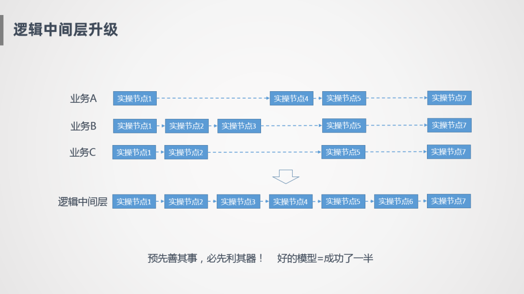 我们想到的比较简单的思路就是建设统一的数据中间层,比如业务A有出库、揽收、派送等几个业务节点,业务B可能是另外几个节点,整个模型是割裂的状态,但实际上业务发展到中后期比较稳定的时候,各个业务模式之间相对比较稳定,这个时候可以对数据进行一个抽象,比如业务A有节点1、节点5和其他几个业务模式是一样的,通过这种对齐的方式,找出哪些是公共的,哪些是非公共的,提取出来沉淀到逻辑中间层里,从而屏蔽各业务之间的差距,完成统一的数据建设。把逻辑中间层进行统一,还有一个很大的原因,业务A,B,C虽然是不同的业务系统,比如履行系统,关务系统,但是本质上都是同一套,底层数据源也是进行各种抽象,所以数仓建模上也要通过统一的思路进行建设。