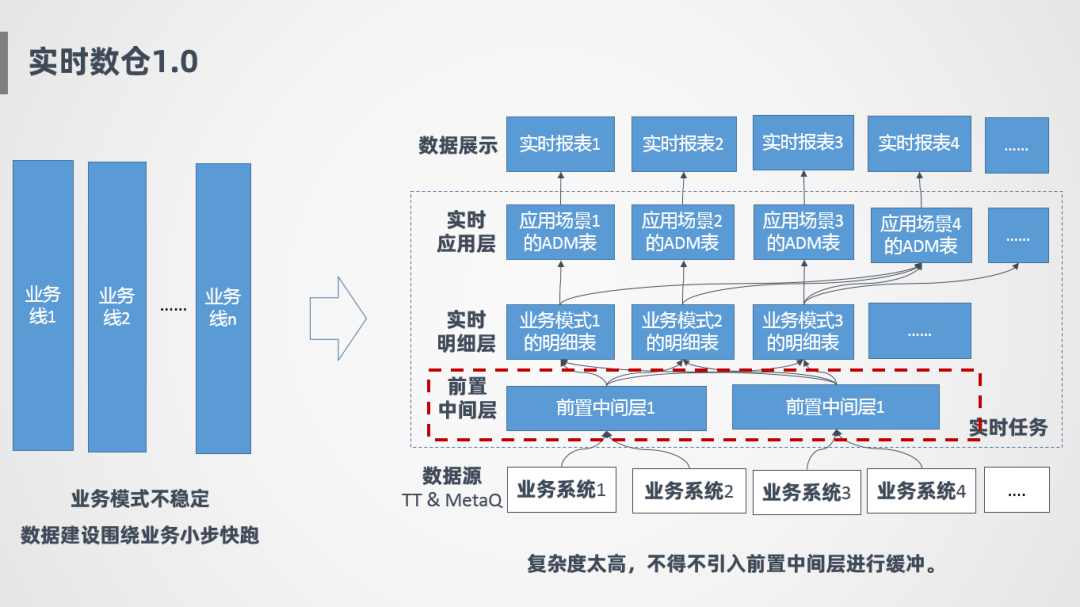 如上图右侧所示,最底层是各个业务系统的消息源,实时任务主要有两层,一层是实时明细层,针对业务线会开发不同的明细表,明细表就是针对该条业务线需要的数据把它抽取过来,在这之上是ADM层,也就是实时应用层,应用层主要针对具体的场景定制,比如有个场景要看整体汇总指标,则从各个明细表抽取数据,产生一张实时汇总层表,整个过程是竖向烟囱式开发,模型比较混乱,难扩展,并且存在很多重复计算。