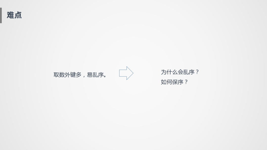 第三个是取数外键多,乱序的问题,乱序其实有很多种,采集系统采集过来就是乱序的,或者传输过程中导致的乱序,我们这边要讨论的是,在实际开发过程中不小心导致的乱序,因为其他层面的东西平台已经帮我们考虑好了,提供了很好的端到端的一致性保证。