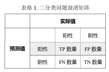 通常我们会用一个矩阵来展示预测结果和实际情况的差异,称为混淆矩阵 (confusion matrix)。二分类的混淆矩阵为 2x2 的,见表 1。为表述方便起见,接下来我们就以 TP 代指真阳性的数量,TN 代指真阴性的数量,FP 代指假阳性的数量,FN 代指假阴性的数量。