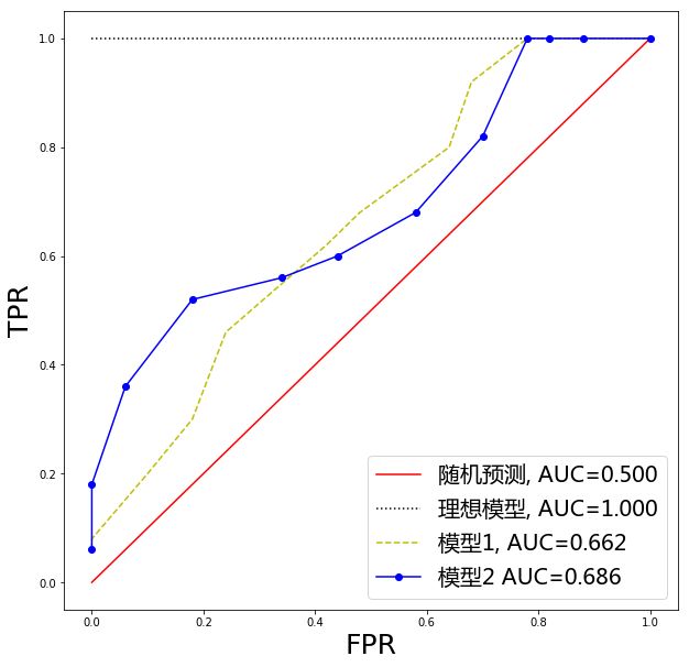 当模型 1 的 ROC 曲线被算法 2 的 ROC 曲线严格包围时,意味着在相同的 FPR(或 Specificity)要求下,模型 2 的 TPR(或 Sensitivity)更高,可以认为模型 2 优于模型 1,如图 1 中的模型 1 就优于随机预测。