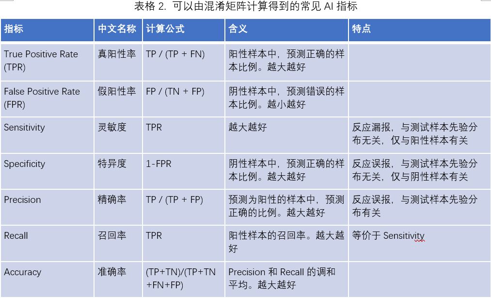 例如,如果我们只关心 AI 模型的灵敏度(Sensitivity),那么我们就只需要把所有的样本预测为阳性,那么 Sensitivity 就等于 1。显然,这不是一个好的模型,因为它会将阴性样本误报为阳性,使得它的特异度(Specificity)为 0。因此,需要同时报告 Sensitivity 和 Specificity。