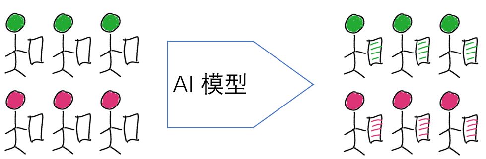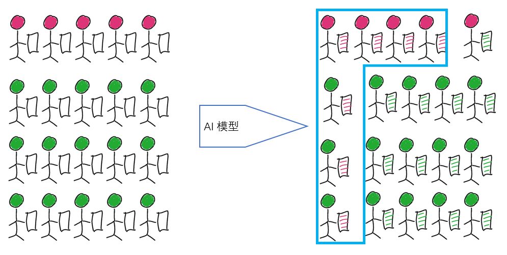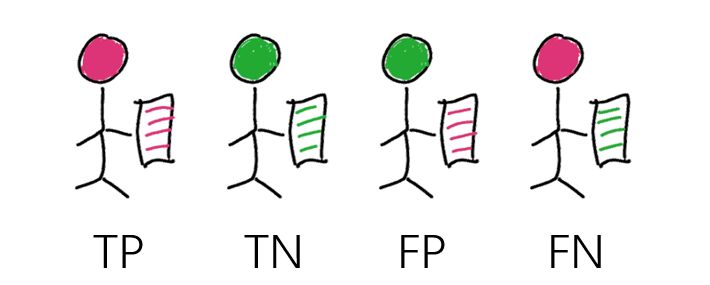我们用一个简单的图来帮助理解,如图 3,红色代表阳性,绿色代表阴性,小人头的颜色代表实际类别,手中拿的诊断颜色代表模型预测的类别。