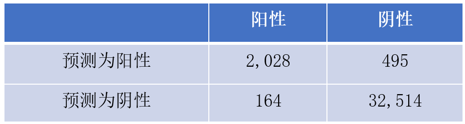 通过文中对数据集的描述,我们知道测试集总共有 35,201 张图片(14,520 只眼),其中 904 只眼是阳性,按照比例估算,得阳性的图片约为 35201*904/14520 = 2192 张,阴性图片约为 35201-2192=33009 张,所以 TP=2192*0.925=2028,TN=33009*0.985=32514 张,FP=33009-32514-495 张,FN=2192-2028=164 张。混淆矩阵如表 3 所示,可算得 Precision=2028/(2028+495)=0.804。比 Specificity 有明显差距。
