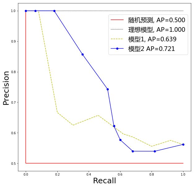 除了 ROC 曲线,另一种常用的是 Precision-Recall 曲线,简称 P-R 曲线。随着阈值的降低,预测的阳性病例增加,预测的阴性病例减少。模型将更多的它认为“不那么确定是阳性” 的样本判断为阳性,通常 Precision 会降低。并且 Recall 不减。以 Precision 为纵坐标,Recall 为横坐标画出 P-R 曲线,如图 2。