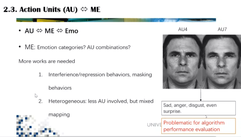 李博士也举例说明了在创建数据库标定过程中遇到的实际困难。首先在微表情出现的过程中可能会出现干扰动作,例如被试人员感到惊讶的过程中为了掩盖这一表情,常常会用眨眼来掩盖。另外李博士提到了抑制性的问题,AU4和AU7作为微表情中常见的动作单元,可能对应多个负面情绪,单纯通过面部呈现特征让计算机分类不太现实。