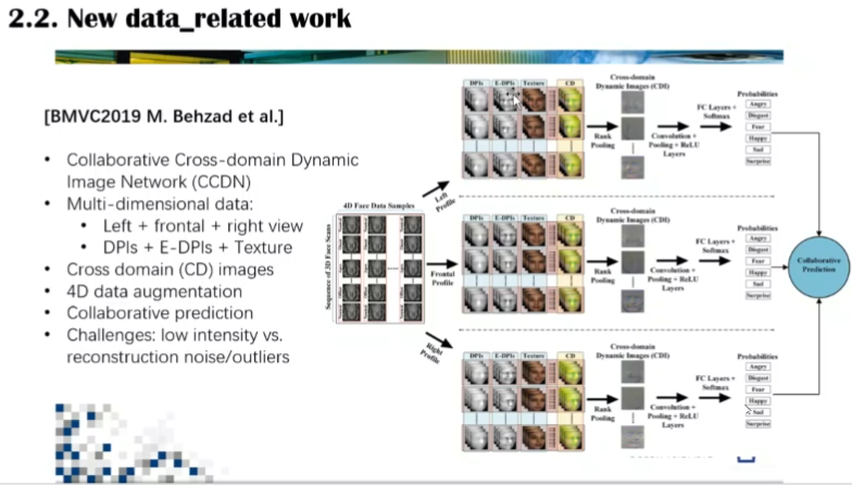 李博士还介绍了她们发表在BMVC2019会议的文章,探讨了哪些方法可以用在4D微表情研究。该文章中,为了减轻输入网络负担、保留有效信息,将样本信息退回到二维,构建了多通道的网络,将深度信息、校正深度信息、纹理信息合成为一个跨域图像序列进行分析。同时,李博士讨论了如何对4D数据进行数据增强,特别是对于微表情,3D重建存在精确度缺失和引入噪声的问题。