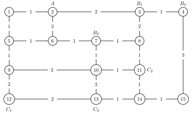 a. 附图中有一个无向图,其中圈内数字代表一个地点,边 e 上的数字代表长度 Le(双向相同)。一位外卖小哥在起点 A,要去 3 个商家(B1,B2,B3)取餐,送到 3 个对应的地方(C1,C2,C3),即 B1 至 C1,B2 至 C2,B3 至 C3。小哥的电动动力车的箱子同时最多装下 2 份外卖。