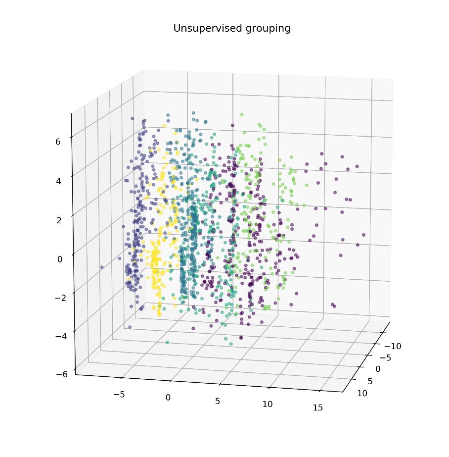 通过对此图的初步观察,数据大部分的差异体现在新的Y(垂直)维度。在X(宽度)和Z(深度)维度中,差异来源于设定的类别,进而导致数据形成垂直方向的条纹。由于群集的各向异性,我们利用有k-nearest neighbor connector参数的层次聚类算法来定义组,这样就不会将条带分割成多个部分。(我们利用层次聚类算法中的k邻近算法,在不把竖状条纹割开的基础上重新定义各个组。)(在Python的sklearn库中,AgglomerativeClustering方法可以用于聚类。本案例中,基于Ward linkage标准把类的数量设置为6,以及由kneighbors_graph包生成连接数组,其中参数n_neighbors设置为20)。