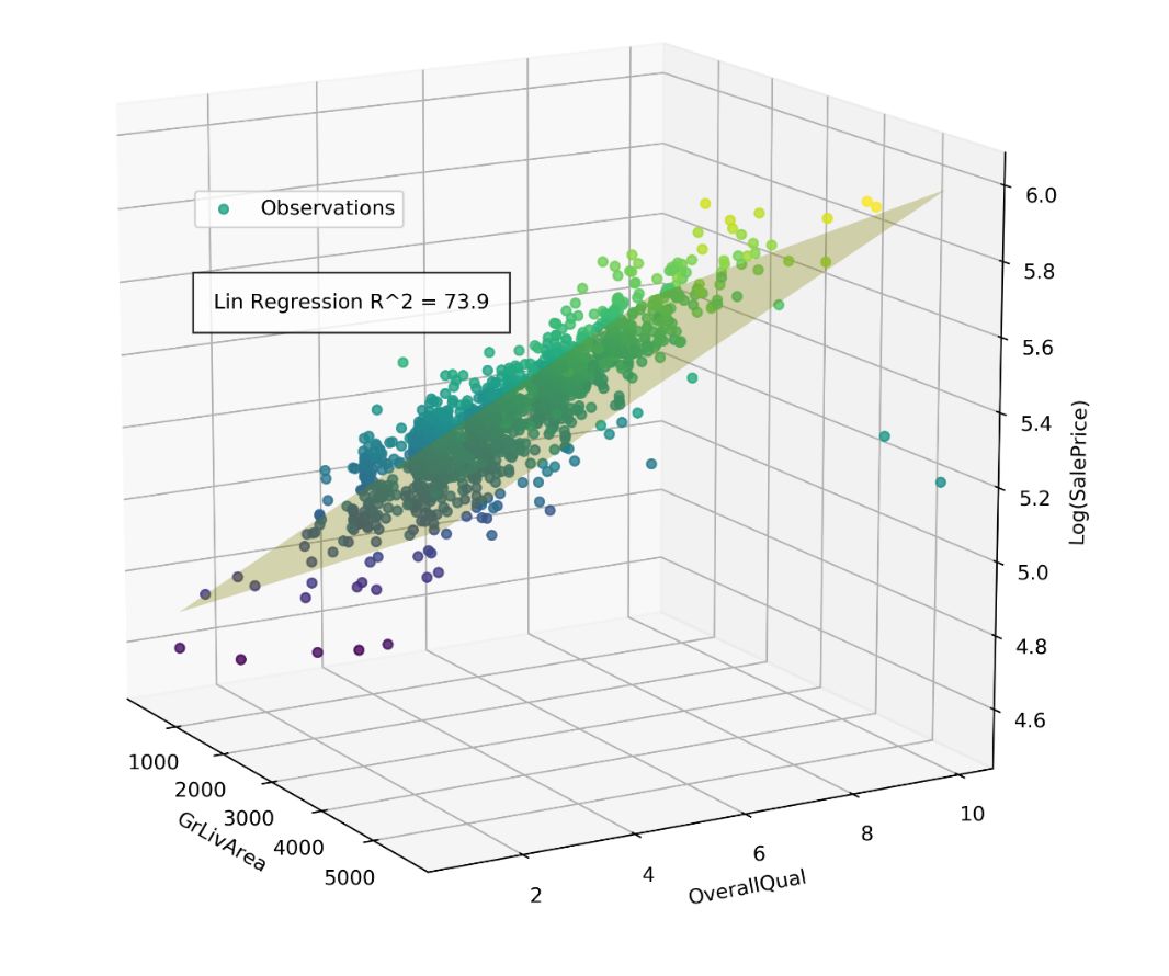 一个简单的线性回归模型可以体现地上居住面积和整体质量对住宅销售价格的影响,它解释了74%的房价变动