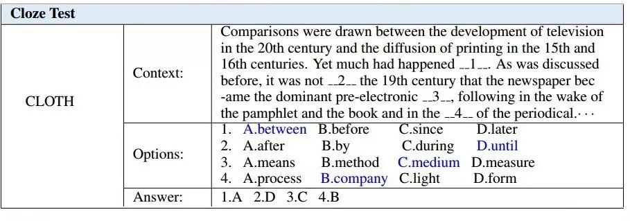 完形填空任务在英语考试中非常常见。如 CLOTH [8] 中的例子所示,原文中的某个词被隐去,我们需要找到正确的词进行填空,使原文变得完整(虽然 CLOTH 数据集中提供了备选答案,但是这在完形填空任务中并不是必需的)。