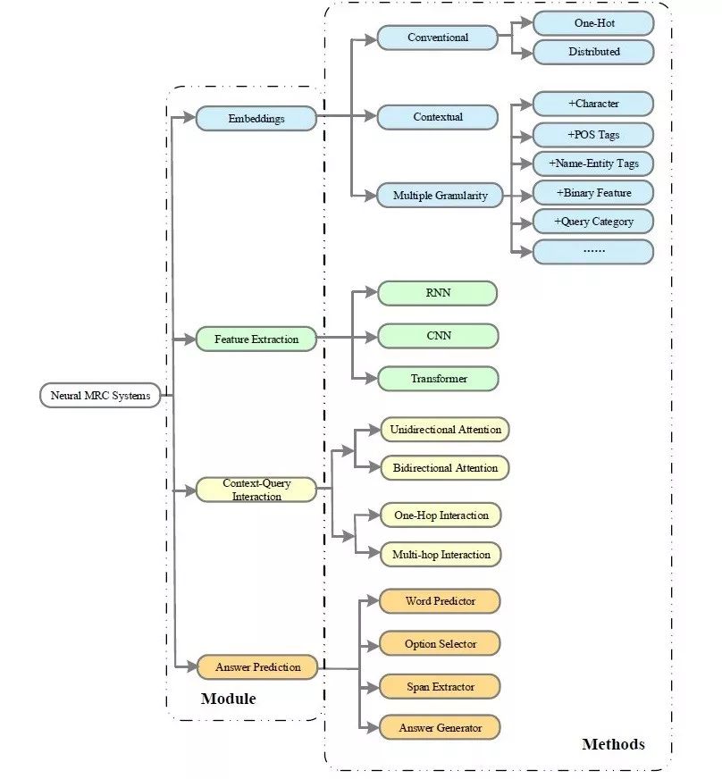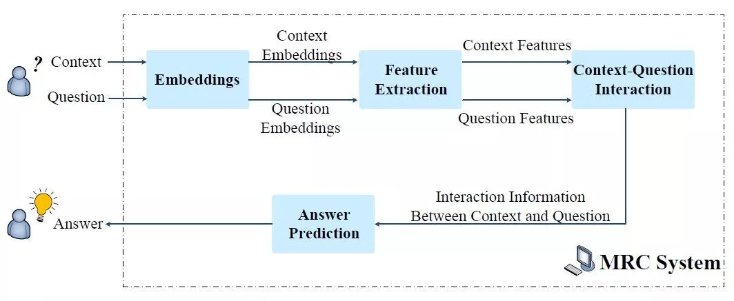典型的机器阅读理解系统一般包括嵌入编码、特征抽取、文章-问题交互和答案预测四个模块。
