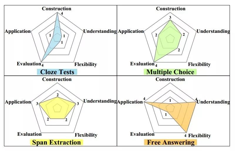 我们从构建难易程度(Construction)、对自然语言理解的测试水平(Understanding)、答案灵活程度(Flexibility)、评价难易程度(Evaluation)和实际应用贴合程度(Application)等五个维度出发,对上述四类常见的机器阅读理解任务进行比较,依据每个任务在不同维度上的表现,得分最低 1 分、最高 4 分,结果如下图所示: