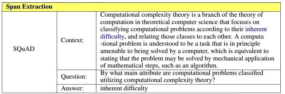 片段抽取任务要求从原文中抽取一个连续的句子(或词组)作为问题的答案。如 SQuAD [2] 中的例子所示,原文中的 inherentdifficulty 被抽取出来作为问题的答案。