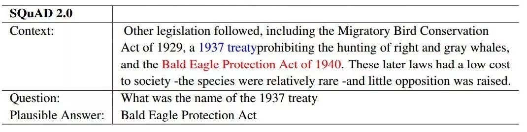 SQuAD2.0 [26] 是带有不能回答问题的机器阅读理解任务的代表数据集。在下面的例子中,问题是“1937 年条约的名字”(What was the name of the 1937 treaty?),但是原文中虽然提到了 1937 年的条约,但是没有给出它的名字,仅根据原文内容不能对问题进行作答,1940 年条约的名字还会对回答问题造成误导。