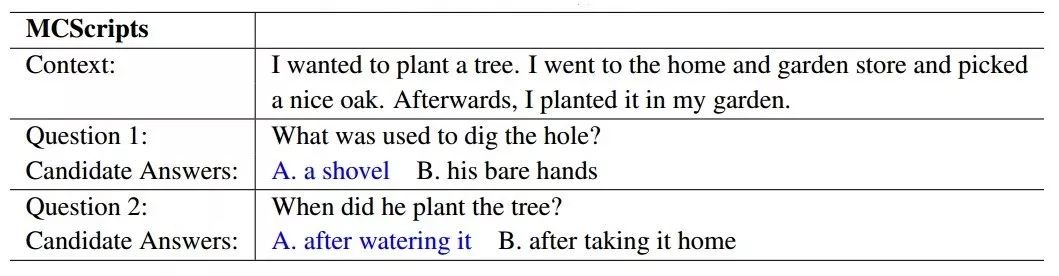 代表性的基于知识的机器阅读理解数据集有 MCScript [25],其中的文本关于人类的一些日常活动,有些问题仅根据给定文本不能作答,需要一定的常识。例如回答“用什么来挖洞”(What was used to dig the hole?)这一问题,依据常识我们知道一般是用“铲子”(a shovel)而不是用“手”(bare hands)。