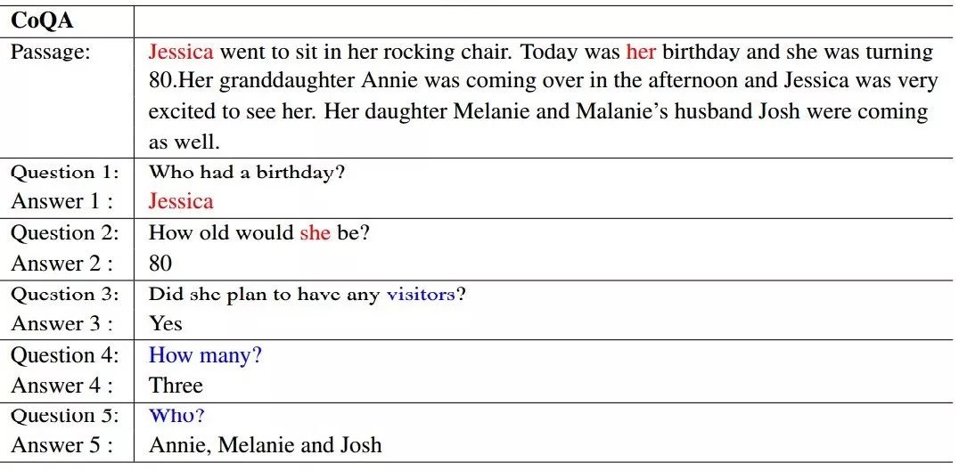 对话式阅读理解的代表性数据集有 CoQA [28]、QuAC [29] 等。下图展示了 CQA 中的一个对话问答的例子。对于给定的文章,进行了五段相互关联的对话,不仅问题之间存在联系,后续的问题可能与之前的答案也有联系,如问题 4 和问题 5 都是针对问题 3 的答案 visitors 进行的提问。