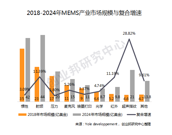 从市场增速看,2018年至2024年CAGR(复合年均增长率)排名靠前的MEMS传感器细分领域有:
