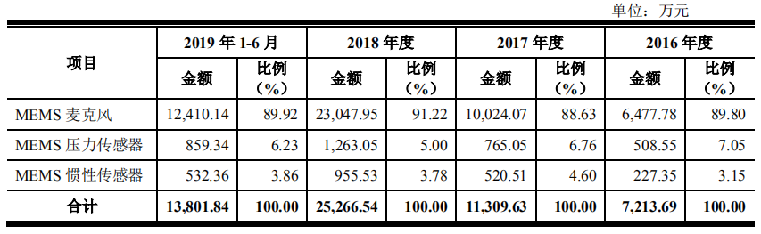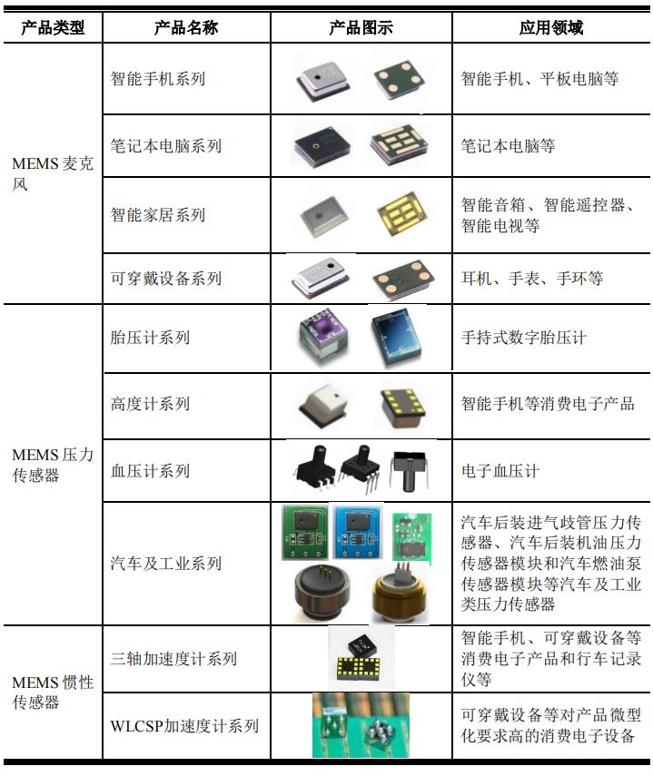 公司目前主要产品线包括MEMS麦克风、MEMS压力传感器和MEMS惯性传感器,各产品线具体情况如下: