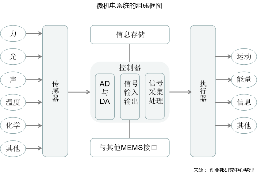 MEMS传感器在结构上主要由微型传感器、微电子控制器、执行器和电源组成。
