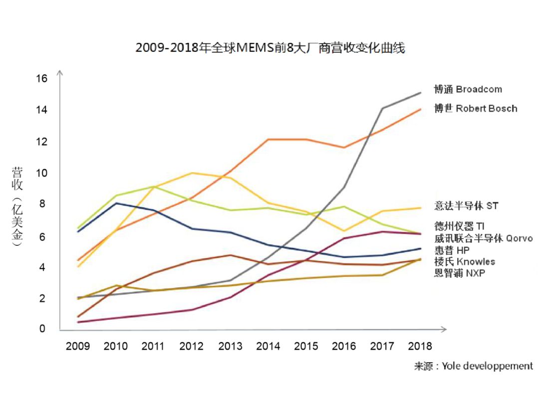 从行业格局来看,2018年博通和博世在MEMS方面的营业收入超过10亿美元,远远领先于第三名的意法半导体。值得关注的是,博通受益于射频MEMS的迅猛发展,从2013年开启了飞速增长模式。全球MEMS的领先厂商还包括德州仪器、惠普、楼氏和应盛美等企业。