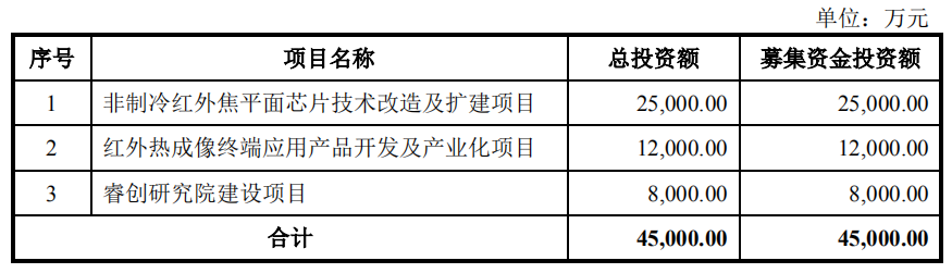睿创微纳专注于非制冷氧化钒探测器、机芯及整机产品的研发、生产和销售,公司研发布局重心在于偏前端的核心器件探测器、机芯等。