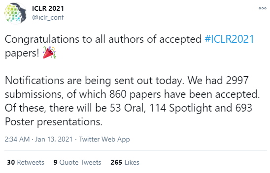 便捷下载,请关注专知公众号(点击上方蓝色专知关注) 后台回复“ICLR2021” 可以获取《ICLR2021放榜了!687篇入选34篇得满分!48篇orals,108篇spotlights,531篇poster》专知下载链接索引