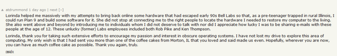 Lorinda Cherry的职业生涯影响了许多人的未来。她帮助过许多人,例如一位在Hacker News悼念并感谢她的人。