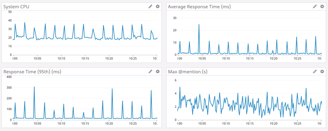 在下图中,我们可以看到 Go 服务的峰值采样时间帧的响应时间和 CPU(图表数据基于 Go 1.9.2。我们尝试了版本 1.8、1.9 和 1.10 版本,但没有任何改善。从 Go 到 Rust 的第一次切换是在 2019 年 5 月完成。)。正如我们所看到的,基本每两分钟就会出现延迟和 CPU 峰值。