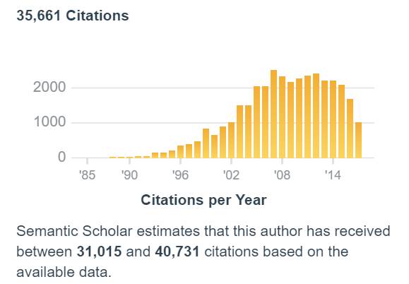 这张图是 Semantic Scholar 平台统计的 Russel 的论文引用情况,据该平台估计,Russell 的引用量大概是 31015 到 40731 之间。