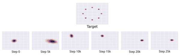 也许有人会问,那不加cycle-consistency,直接用GAN学习一个 的映射,让生成的Y的样本尽量毕竟Y里本身的样本可不可以呢?这个作者在文中也讨论了,会产生GAN训练中容易发生的mode collapse问题。mode collapse问题的一个简单示意如下[11]:
