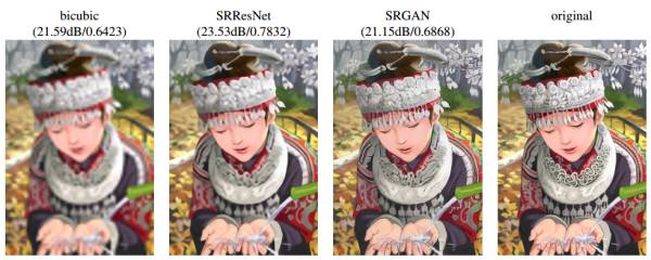 正是上篇文章中讲过的C-GAN,条件C就是低分辨率的图片。SRGAN生成的超分辨率图像虽然PSNR等和原图直接比较的传统量化指标并不是最好,但就视觉效果,尤其是细节上,胜过其他方法很多。比如下面是作者对比bicubic插值和基于ResNet特征重建的超分辨率的结果: